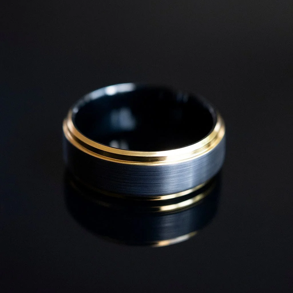 Strong. Fearless. Unshakable. Like the legend of Gotham, you fight those you love, even when no one is watching. Let this black and gold men's wedding band be your reminder of greatness.